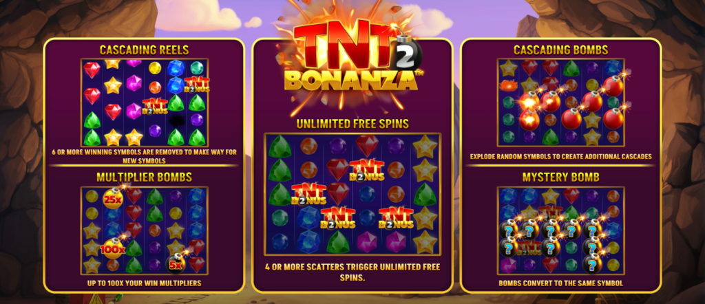 TNT Bonanza 2 packs a punch with exciting features designed to keep the gameplay thrilling and rewarding. Here’s a breakdown of the key features: