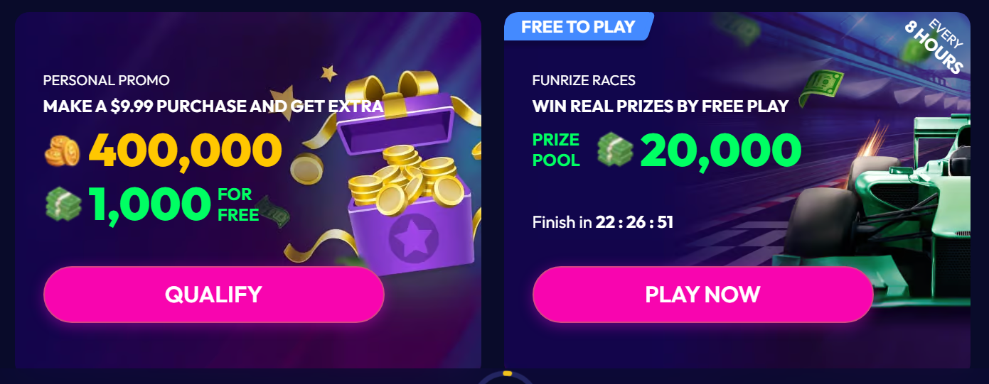 When you make a purchase of over $9.99, you automatically qualify for a generous deposit bonus. This includes an additional 400,000 Free Coins and 1,000 Promotional Entries, significantly enhancing your playing potential. This bonus allows you to maximize your gameplay and explore more of what Funrize Casino has to offer.