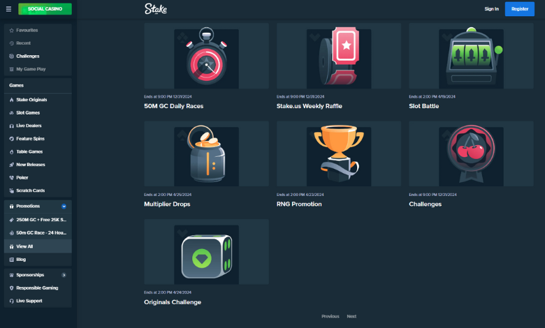 - RNG Promotion and Challenges: Engage with specific games and targets to win additional Stake Cash and Gold Coins, including daily challenges and the Originals Challenge with a unique game each week.